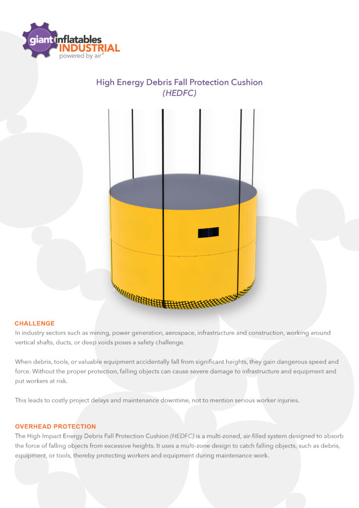 The High Impact Energy Debris Fall Protection Cushion (HEDFC) is a multi-zoned, airfilled system designed to absorb the force of falling objects from excessive heights. It uses a multi-zone design to catch falling objects, such as debris, equipment, or tools, thereby protecting workers and equipment during maintenance work.